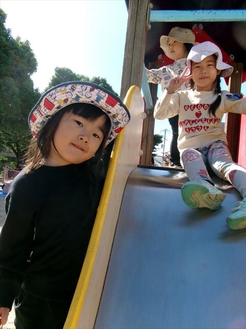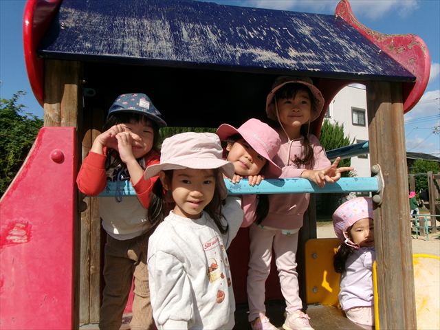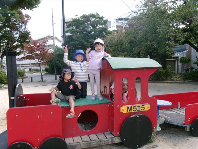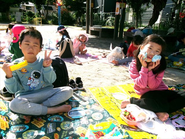 いい天気の中、常光寺南公園に行きました。公園の遊具でいっぱいあそび、おいしいお弁当を食べ「また公園行こうね!」と話し楽しい遠足になりました。