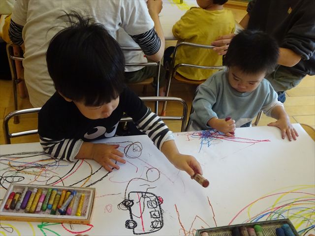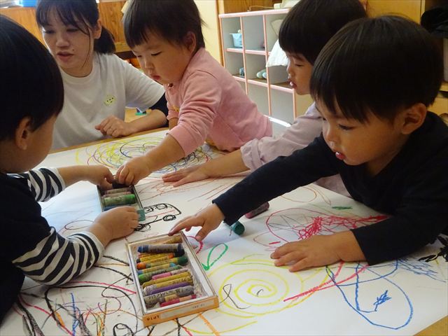 大きな紙に、おえかきをしました。まるをかいたり、ぐるぐるをかいたり、いろいろな色で、おえかきを楽しみました。