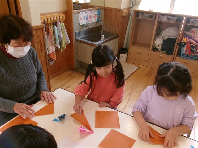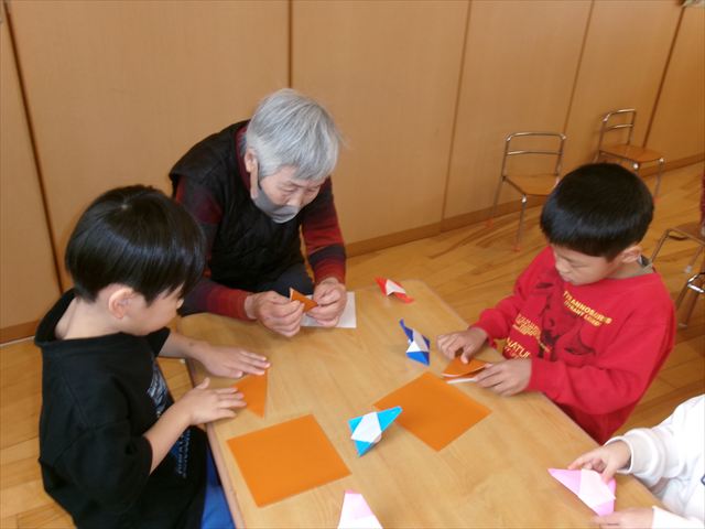 地域のおばあちゃんたちが遊びに来てくれて嬉しそうな子どもたち。折り紙でサンタ・トナカイを一緒に折りました。