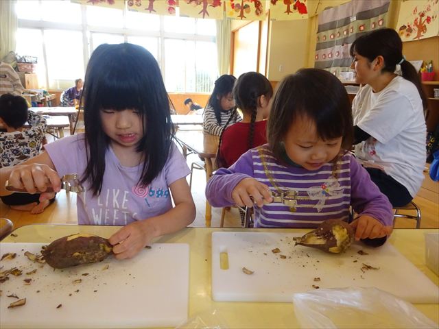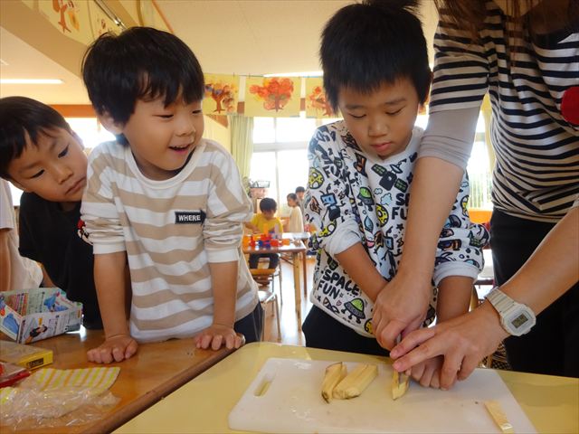 園で採れたさつまいもを使って、さつまいもスティックを作りました。丁寧に包丁で切る子どもたち。甘いさつまいもを味わっていました。